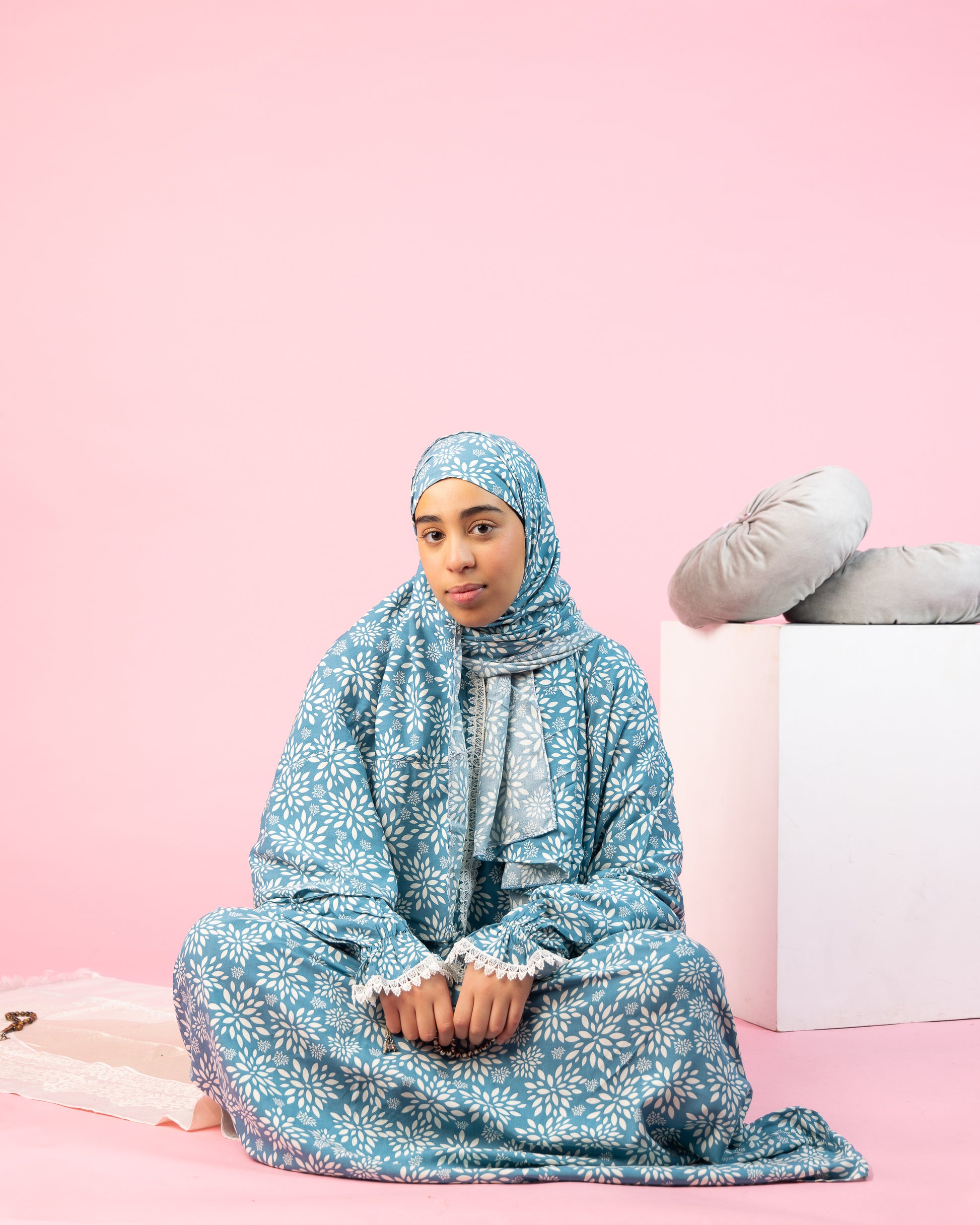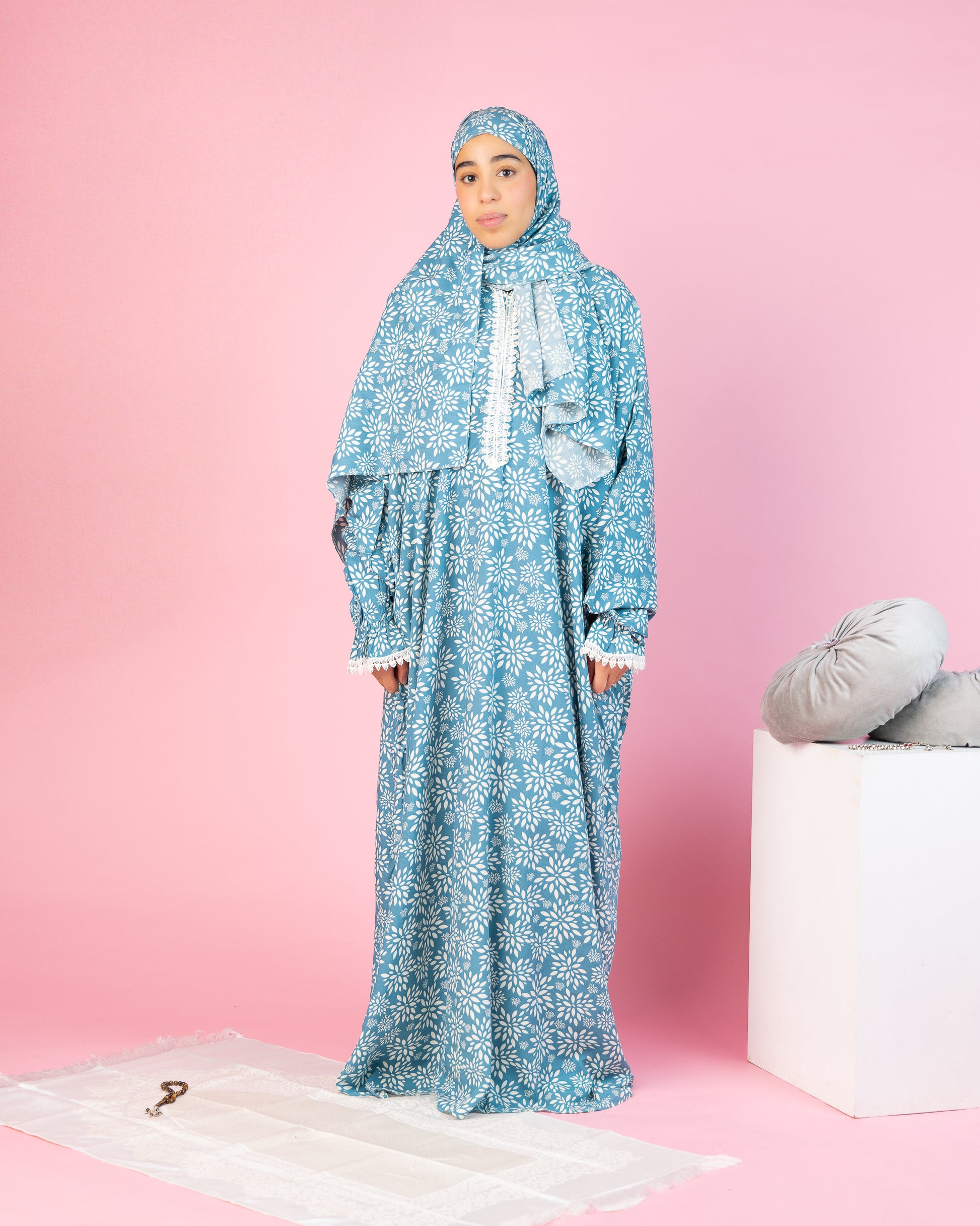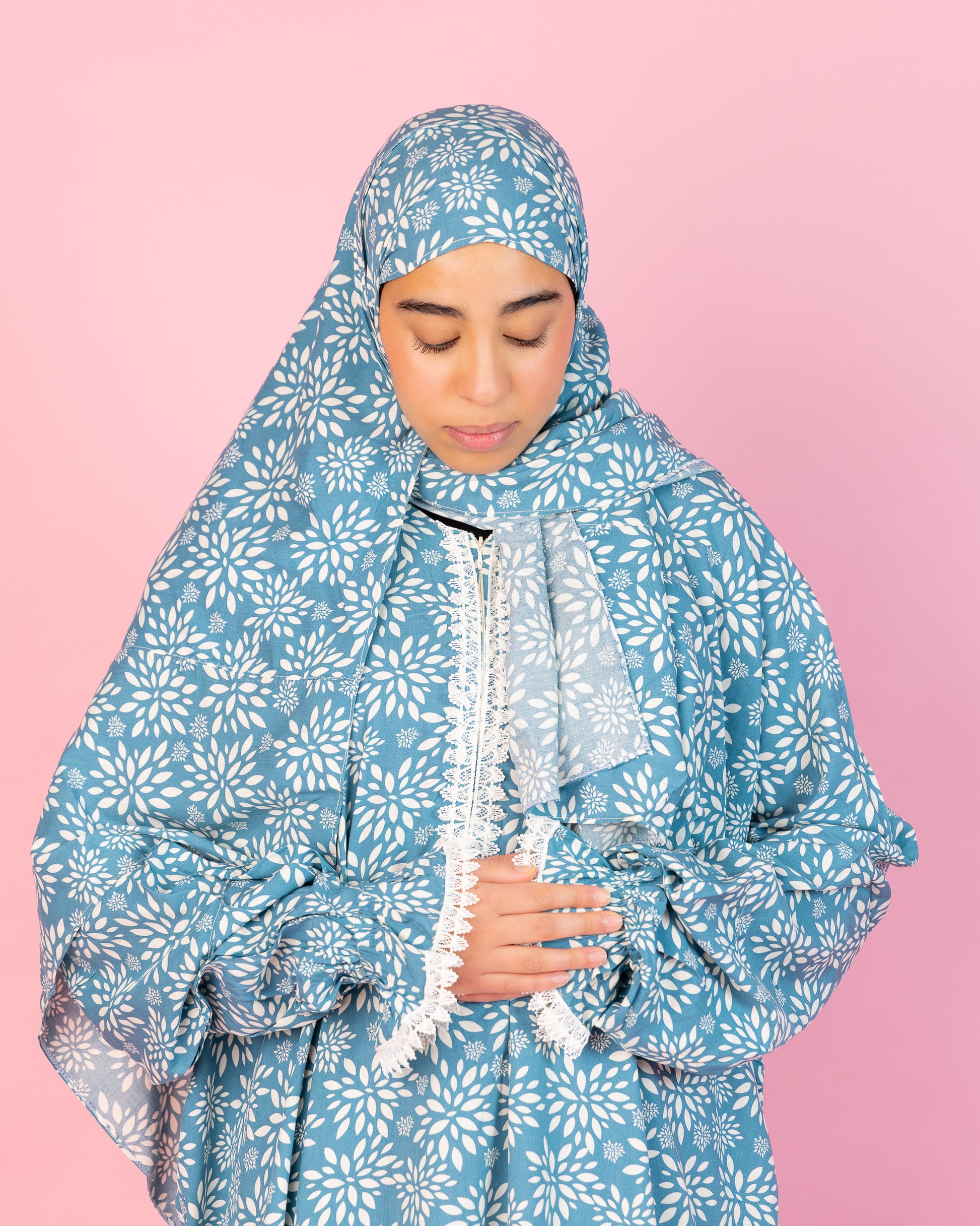 Elevate your spiritual moments with our Floral Serenity Prayer Set, designed for ultimate comfort and modest elegance. This beautifully crafted two-piece attire features a flowing full-length prayer dress and a matching hijab, made from soft, breathable fabric to ensure ease of movement and coverage during prayer.