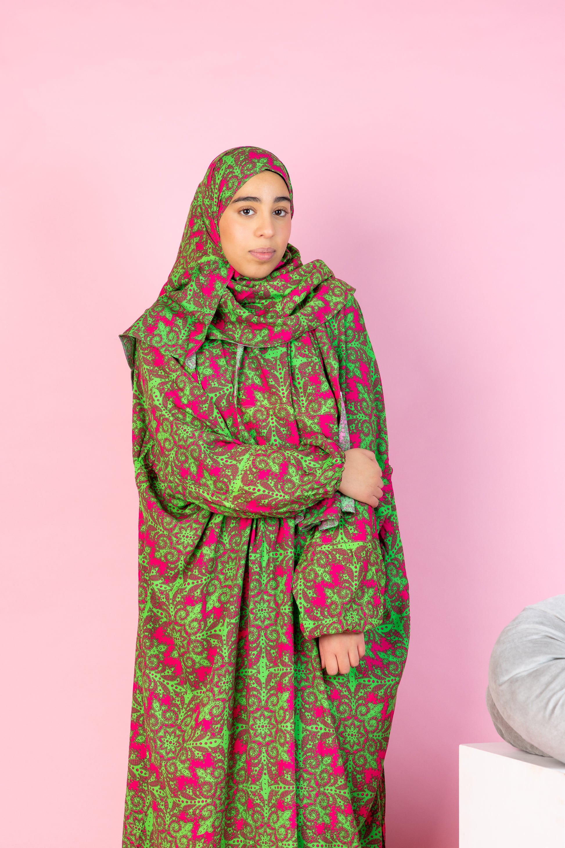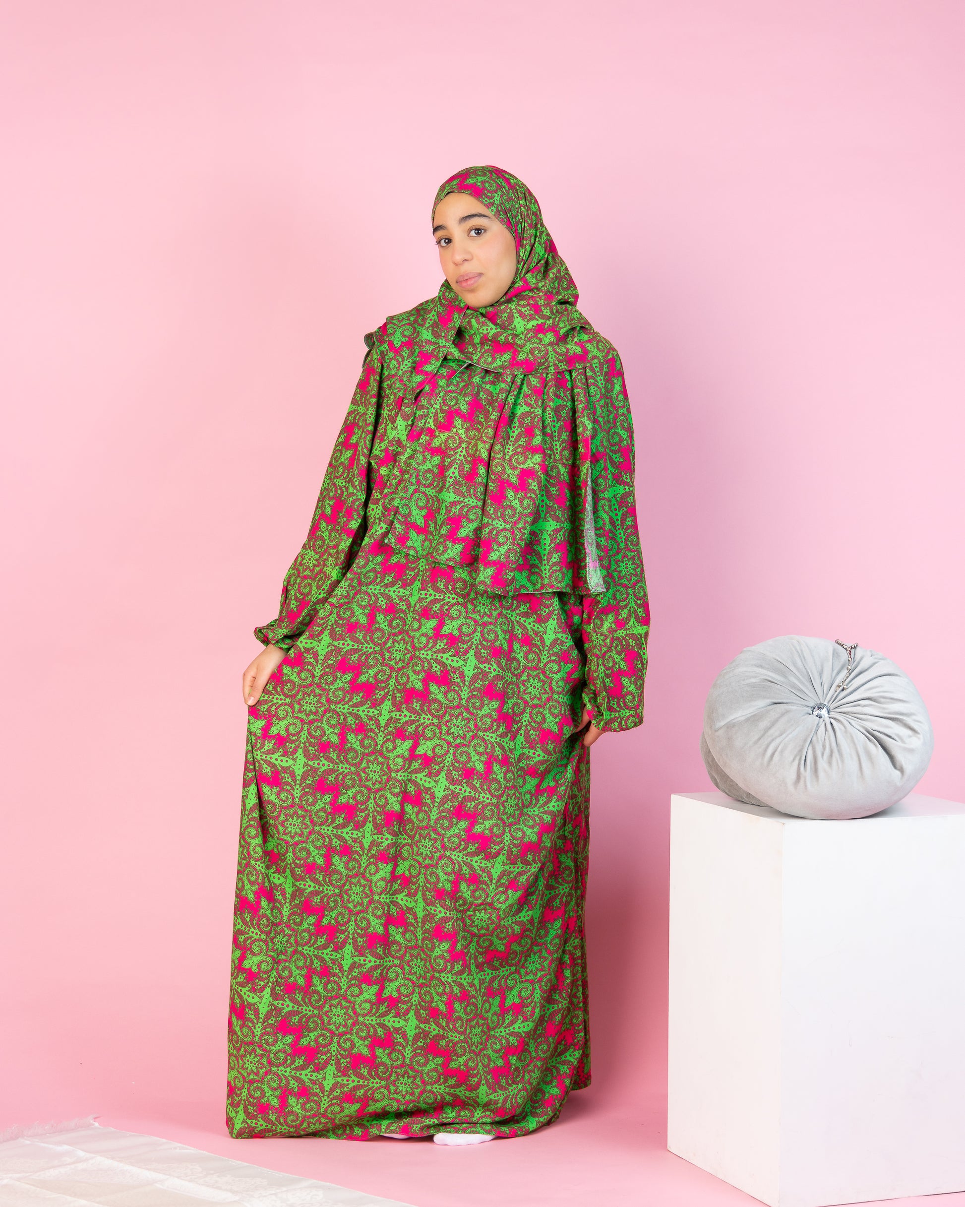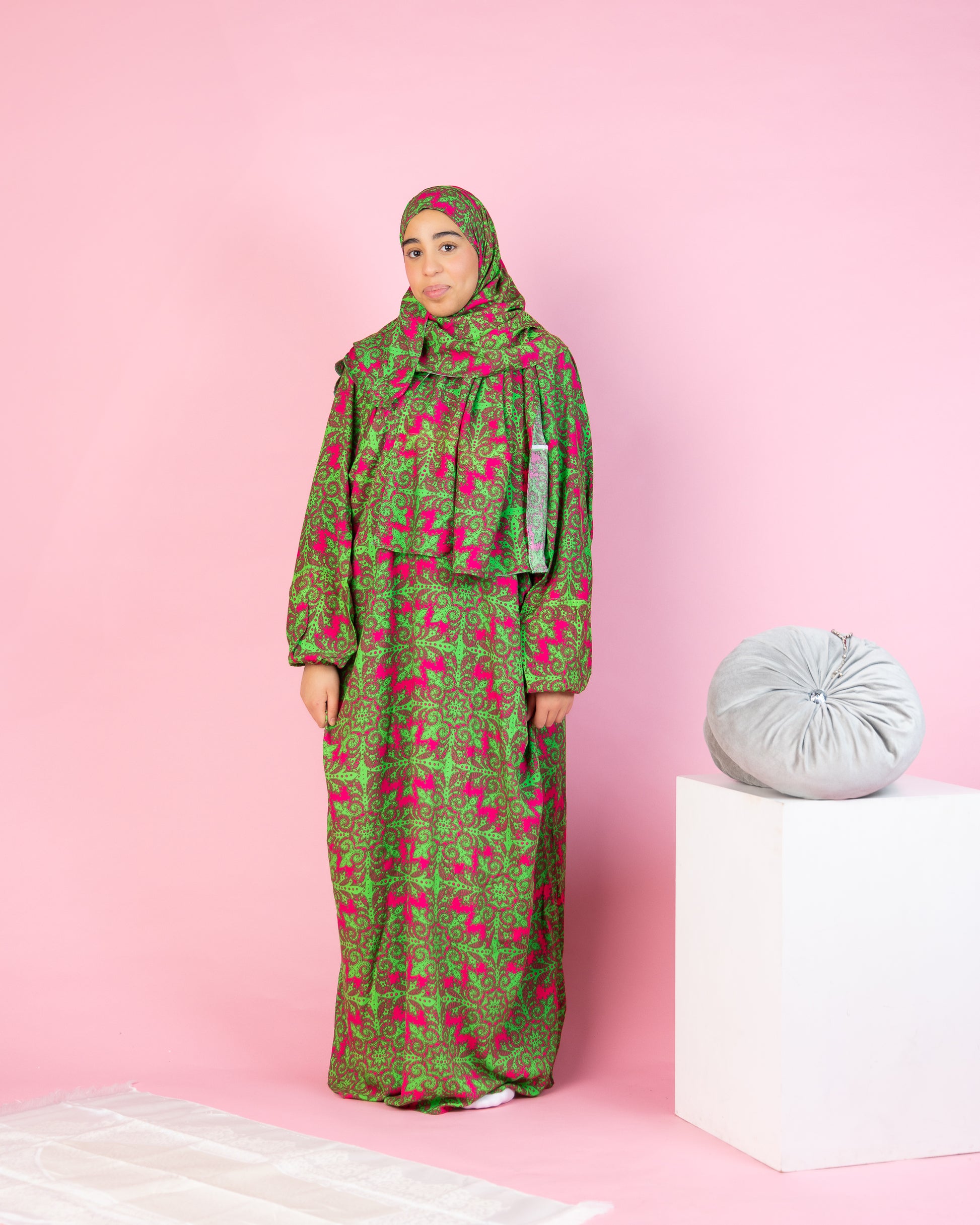 Elevate your spiritual moments with our Floral Serenity Prayer Set, designed for ultimate comfort and modest elegance. This beautifully crafted two-piece attire features a flowing full-length prayer dress and a matching hijab, made from soft, breathable fabric to ensure ease of movement and coverage during prayer.