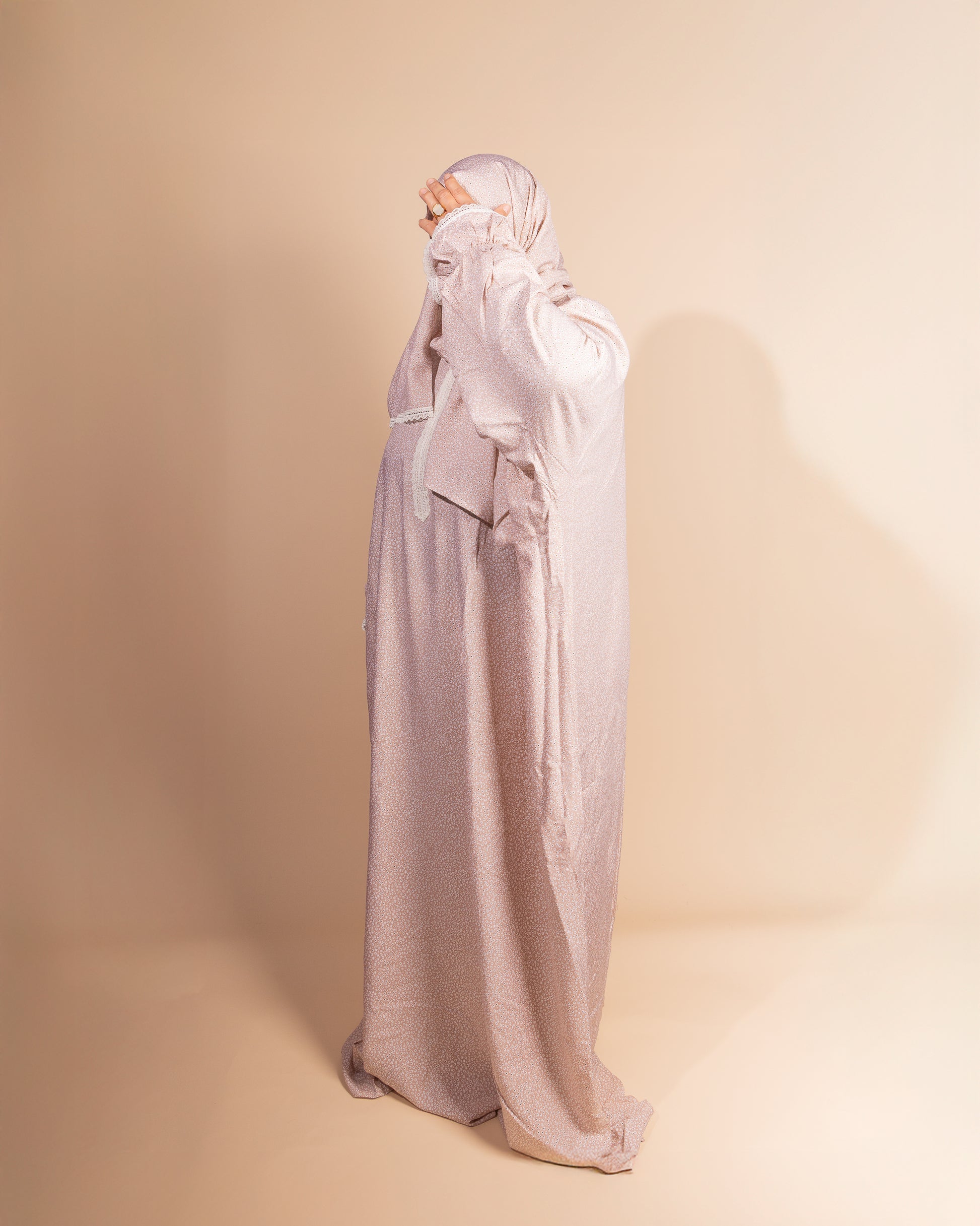 - The matching headscarf is attached to the prayer dress, ensuring a secure and effortless fit without the need for pins or adjustments.