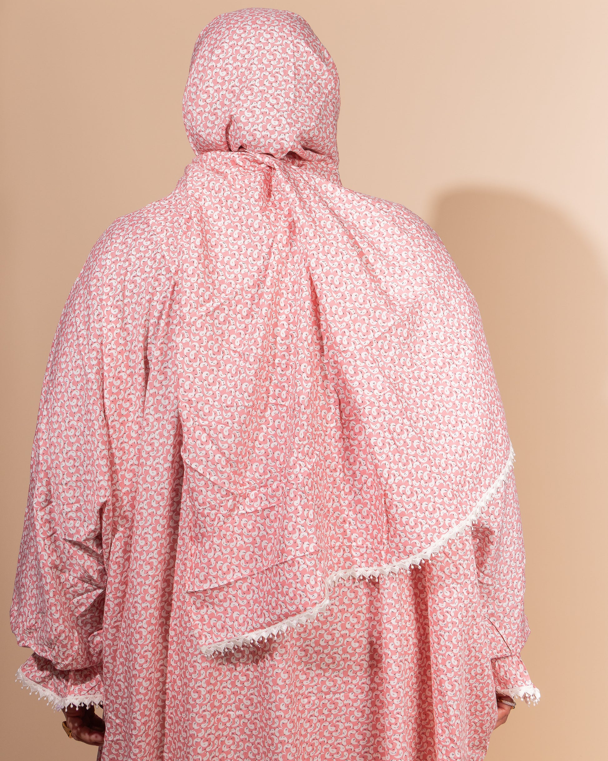 - The matching headscarf is attached to the prayer dress, ensuring a secure and effortless fit without the need for pins or adjustments.